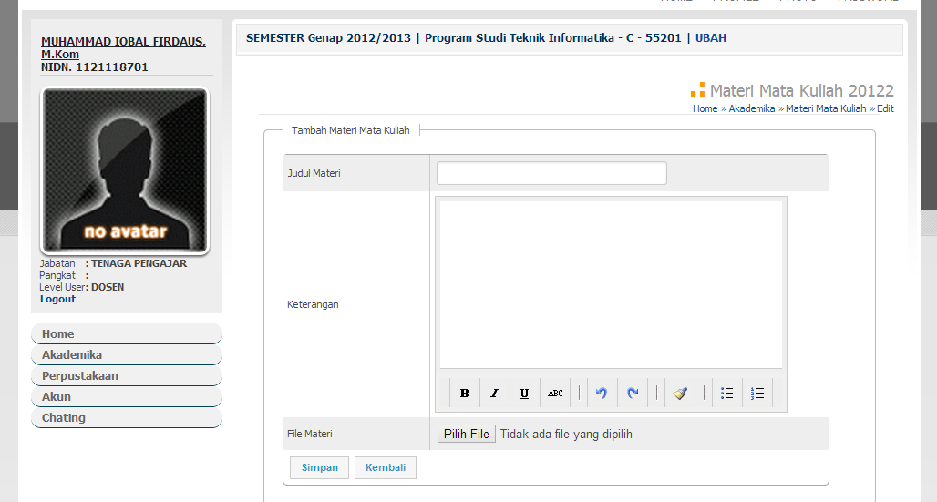 1. Pilih menu Akademika >> "Materi Mata Kuliah" di menubar, kemudian akan tampil page seperti di atas.