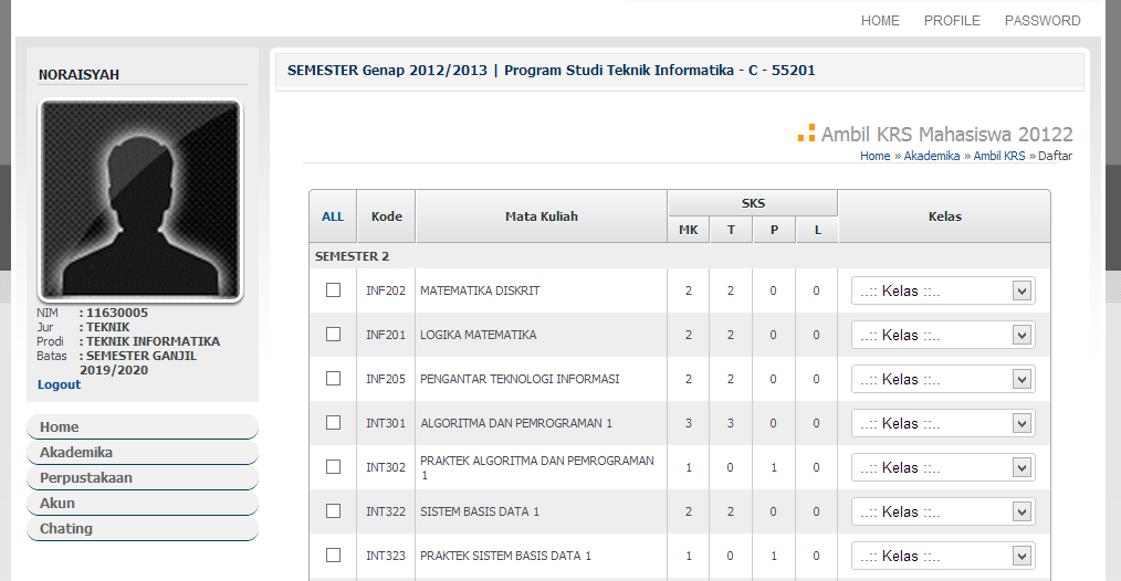 1. Pilih menu Akademika >> "Ambil KRS" di menubar, kemudian akan tampil page seperti di atas.