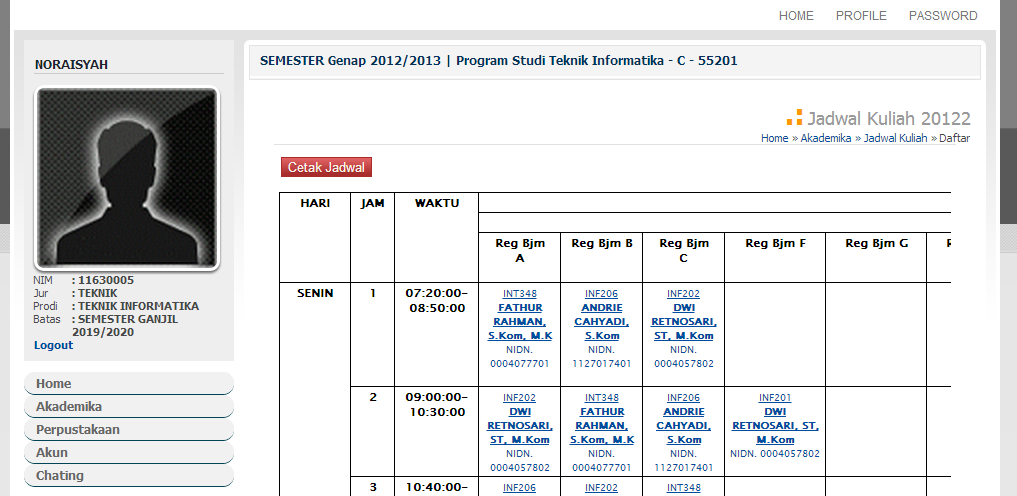 1. Pilih menu Akademika >> "Jadwal Kuliah" Jadwal untuk melihat jadwal sesuai semester dan kelas mahasiswa