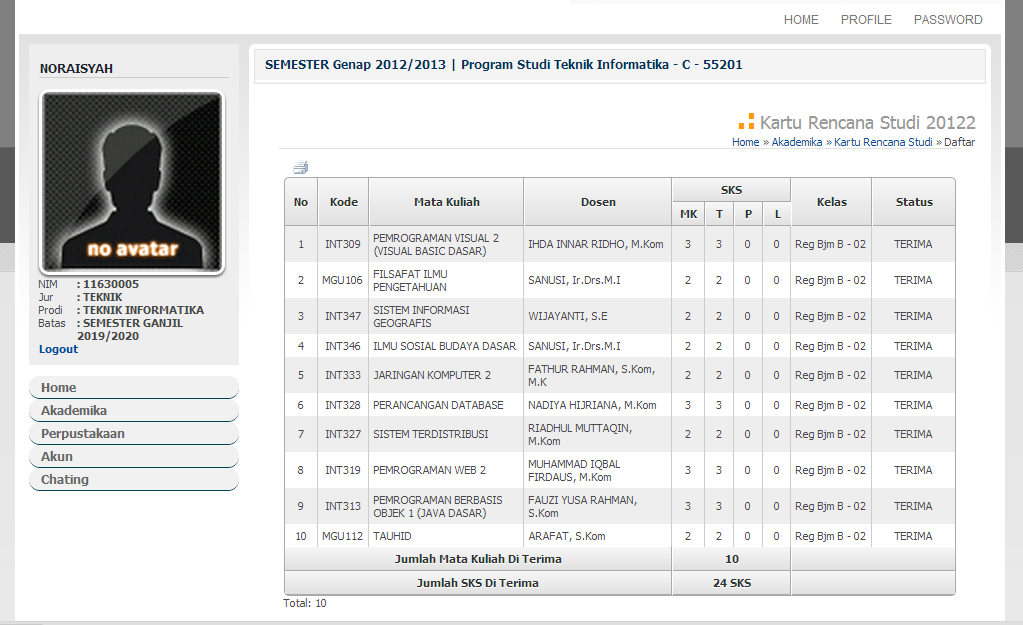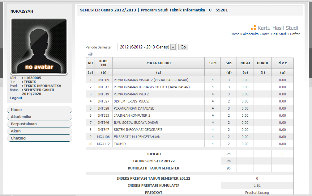 1. Pilih menu Akademika >> "Kartu Hasil Studi" di menubar, kemudian akan tampil page seperti di atas.